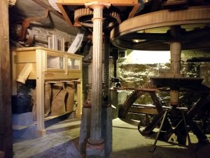 La mouture est réalisée au moyen des anciennes meules de pierre, accouplées mécaniquement à la roue du moulin via les engrenages bois sur fer.
